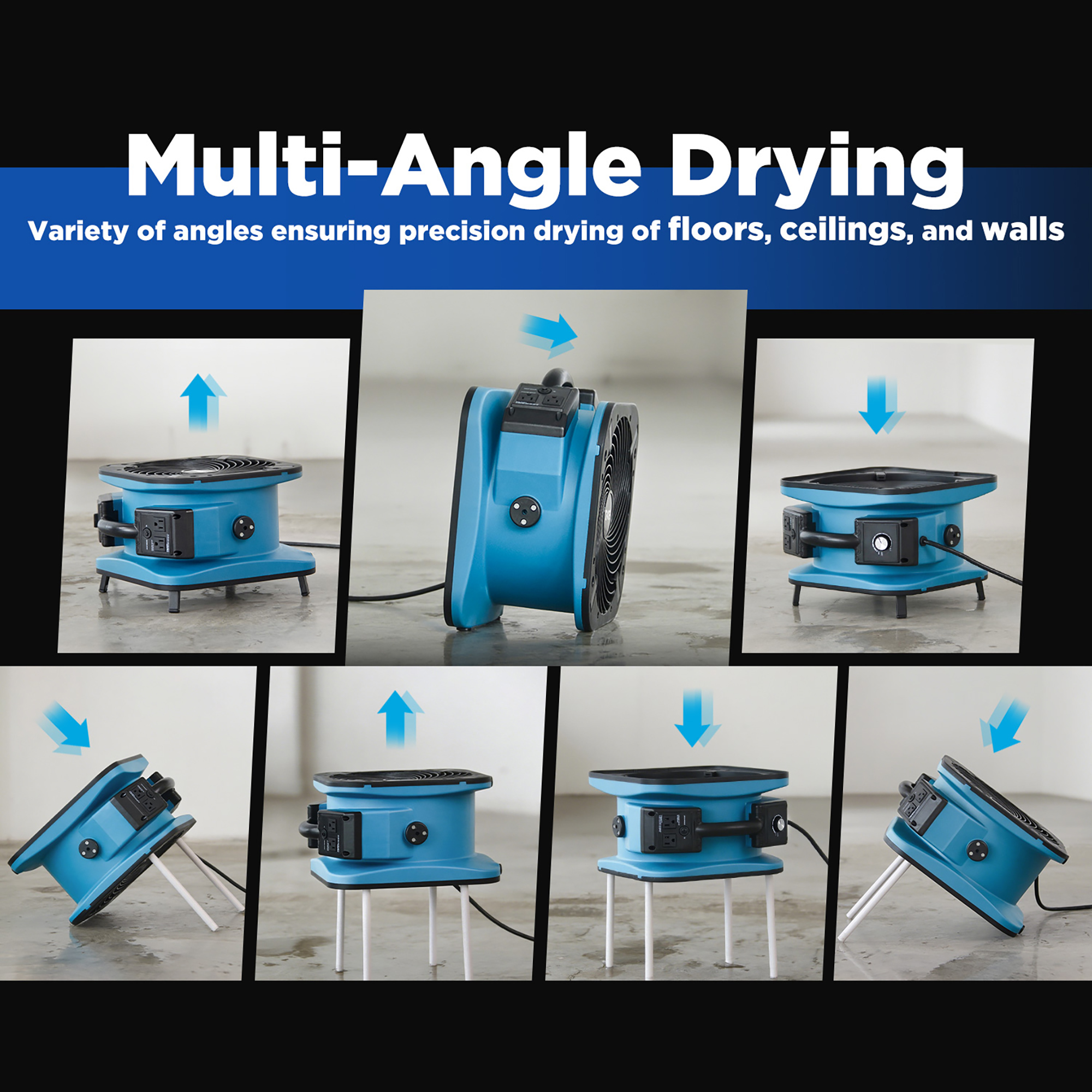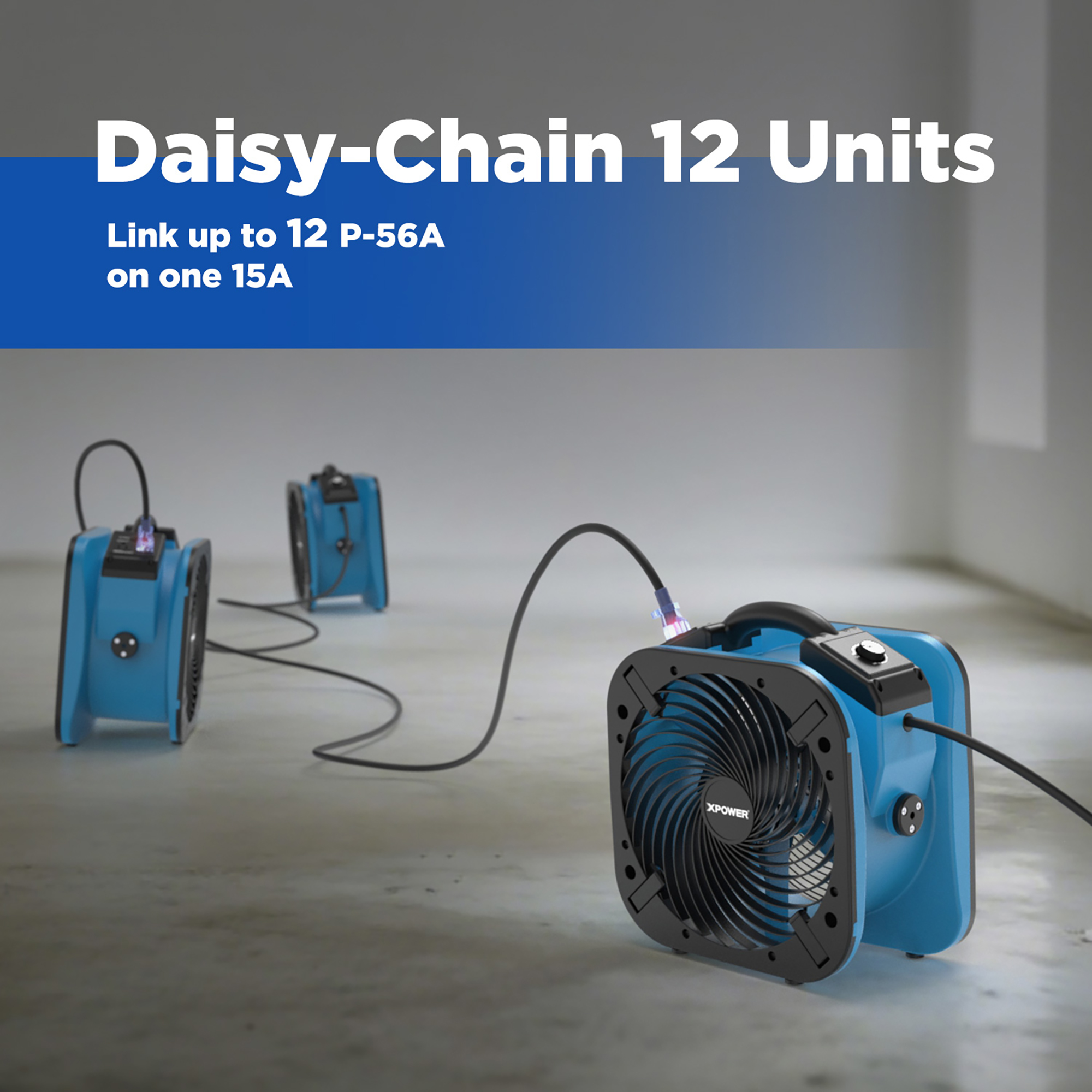 O XPOWER P-56A é um circulador de ar industrial compacto e potente, ideal para a secagem rápida de pisos, carpetes e estofos. Graças ao design exclusivo com fluxo de ar direcionado para baixo (downdraft), garante elevada eficiência com baixo consumo energético. Perfeito para uso profissional, ventilação e recuperação de danos por água.